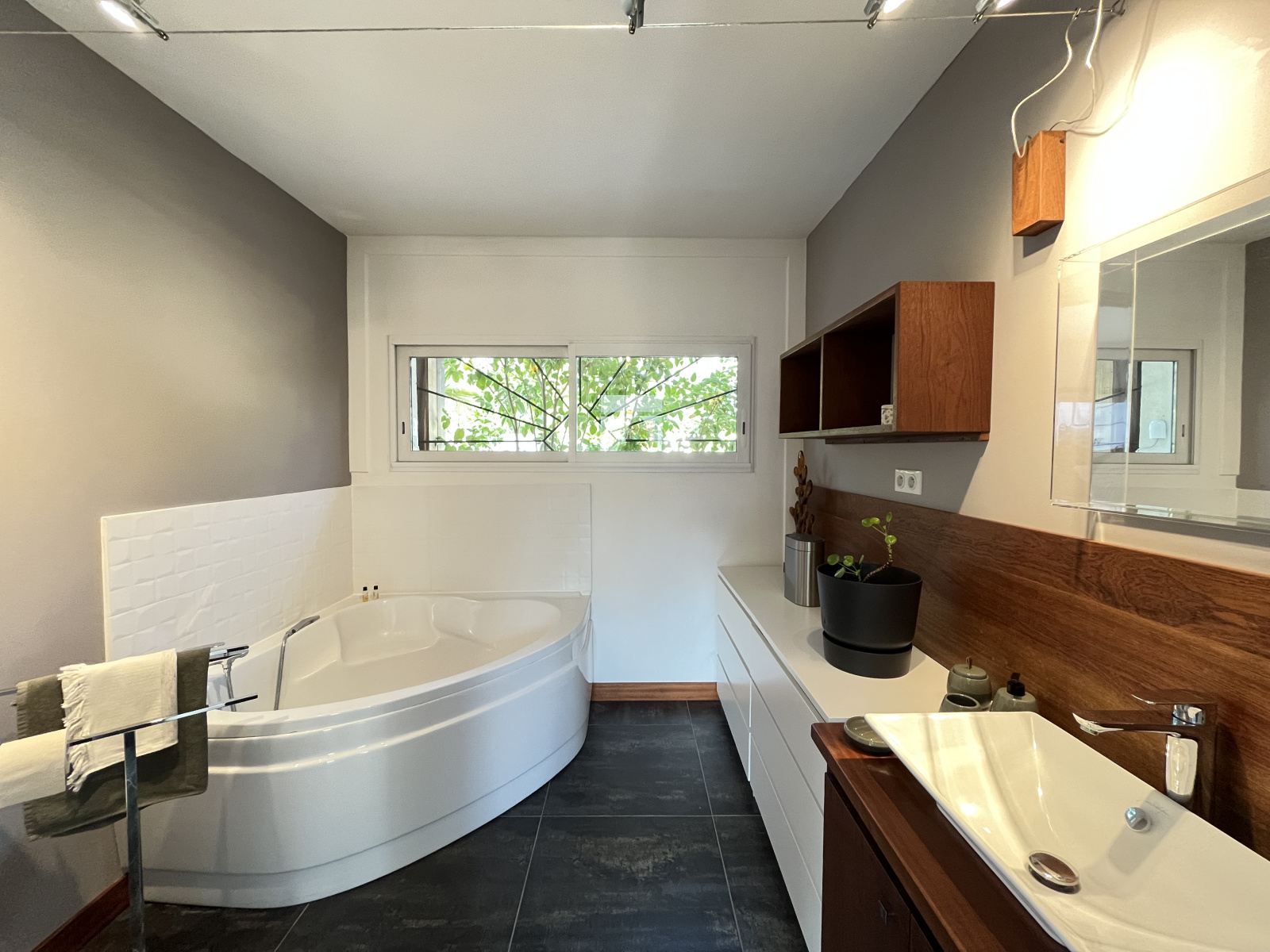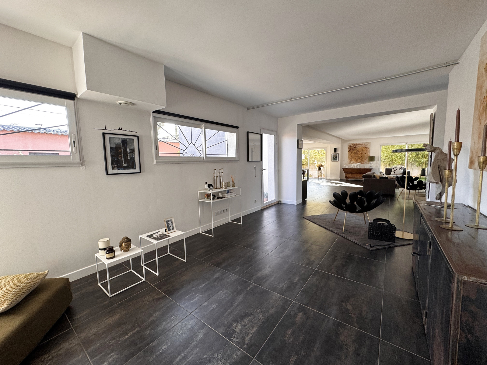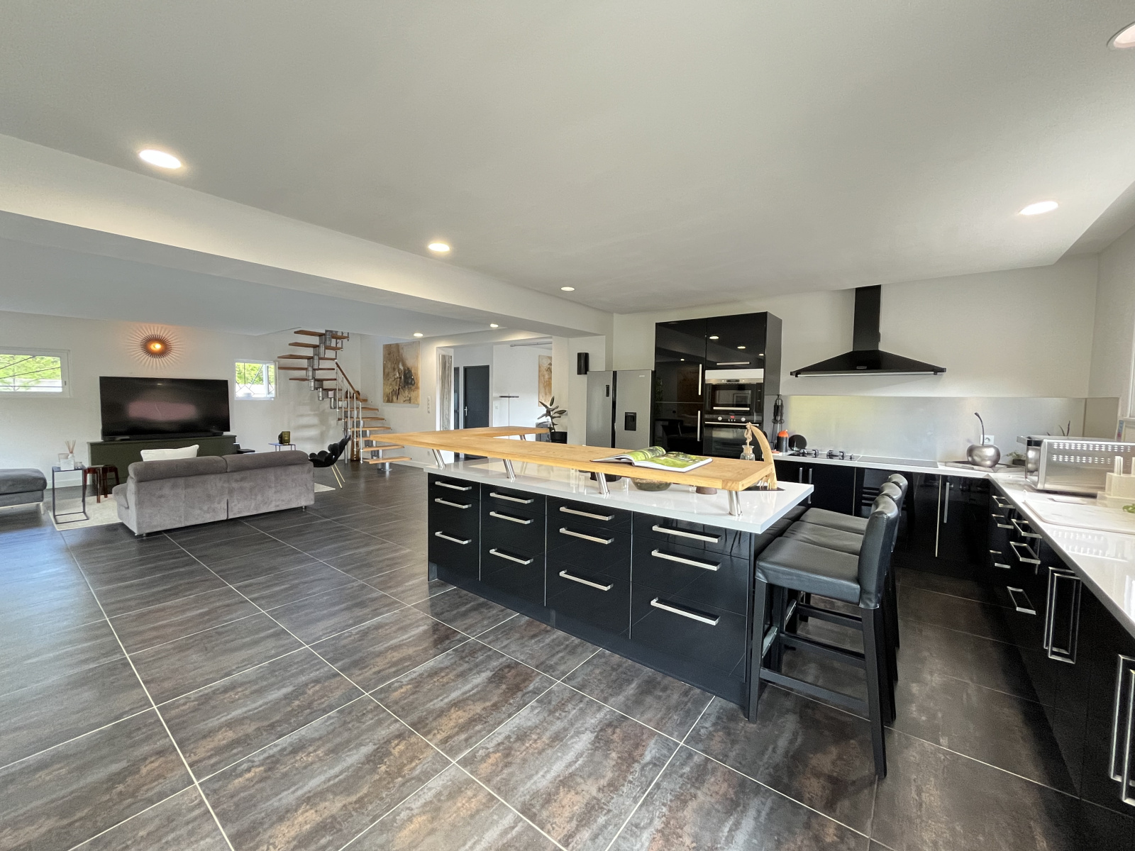 À l’intérieur, le rez-de-chaussée accueille une vaste pièce de vie d’environ 95 m² regroupant un salon, une salle à manger et une cuisine ouverte, baignée de lumière. Ce niveau comprend également un bureau de 18 m², une chambre, une buanderie, ainsi qu’une belle salle de bain avec toilettes.