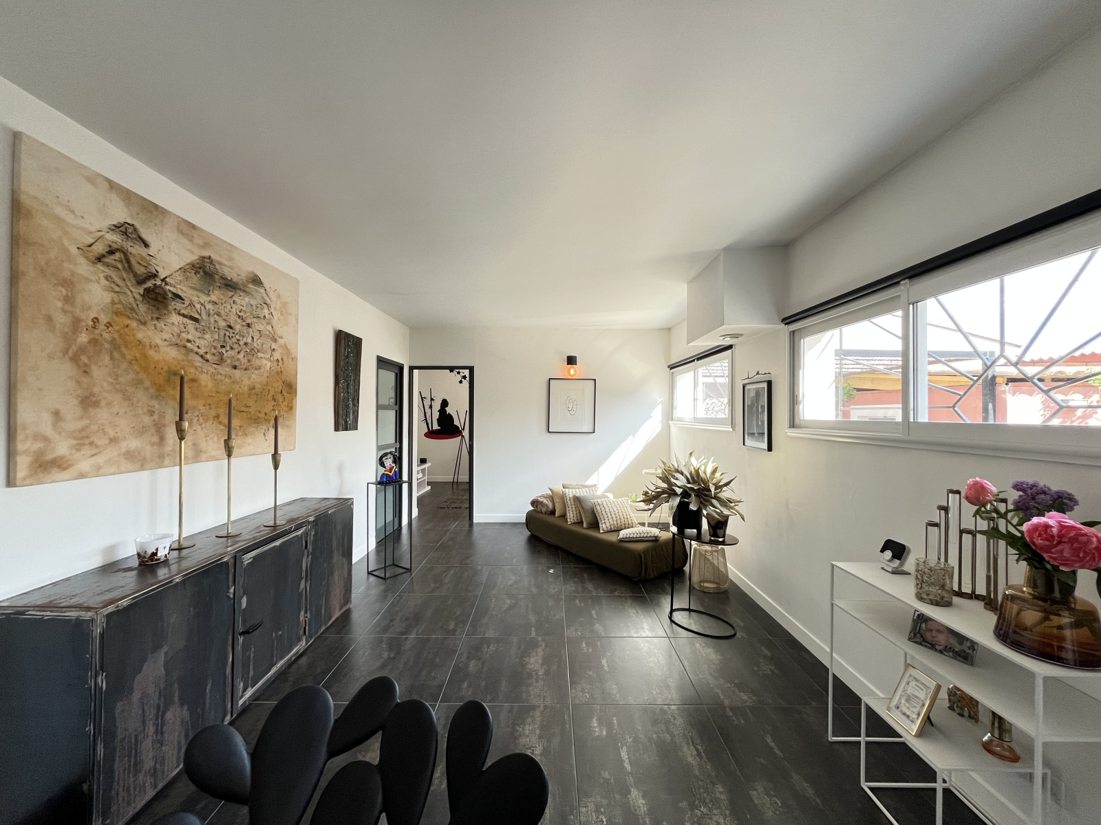 À l’étage, une chambre principale de plus de 35 m², équipée de placards et de grandes baies vitrées, offre une luminosité remarquable. Ce niveau dispose également d’une salle d’eau moderne avec douche à l’italienne, d’un WC indépendant et d’une grande terrasse en L desservant les différentes pièces.
