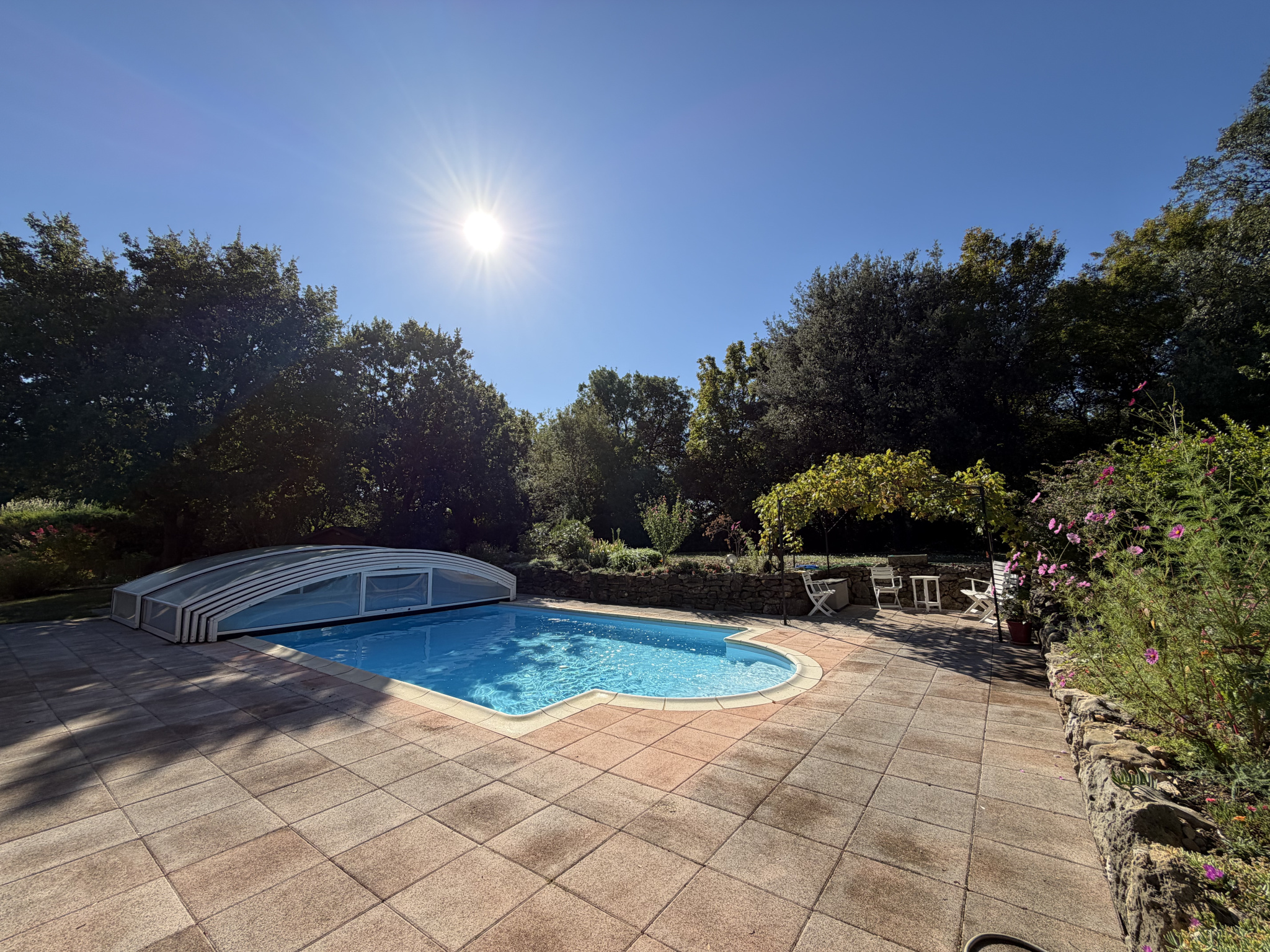 À l’extérieur, un abri voiture, un garage, un cellier et une piscine 10 x 5 mètres avec nage à contre-courant.